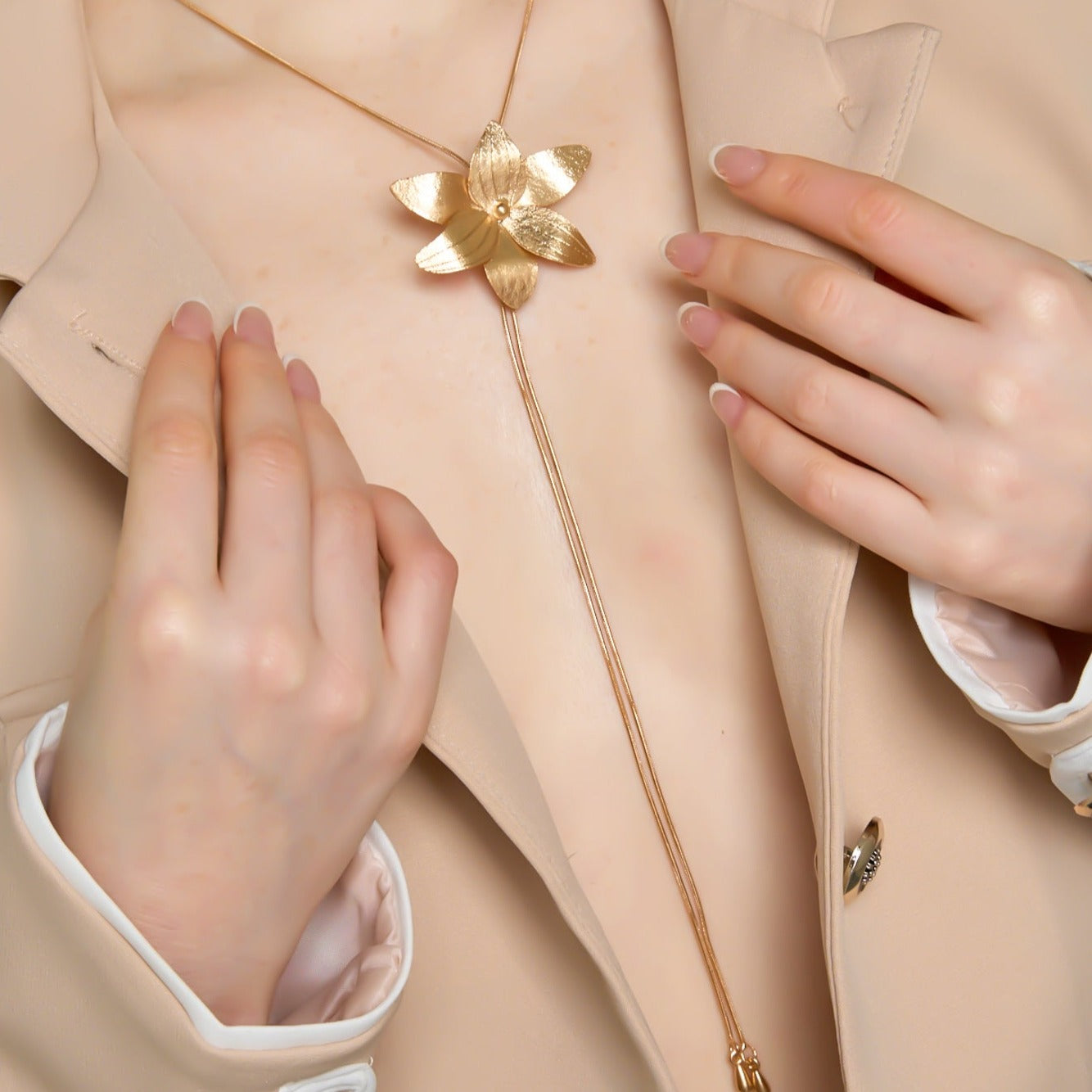 Collar Corbatín Flor Orquídea Dorado elaborado a mano en bronce con baño de oro de 24k.