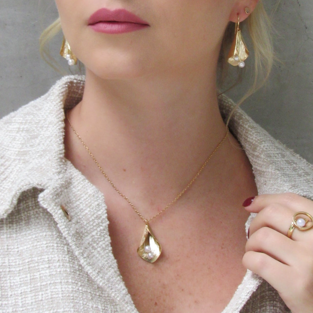 Collar Flor Cayena Pistilos Perlas Dorados elaborado a mano en bronce con baño de oro 24k.