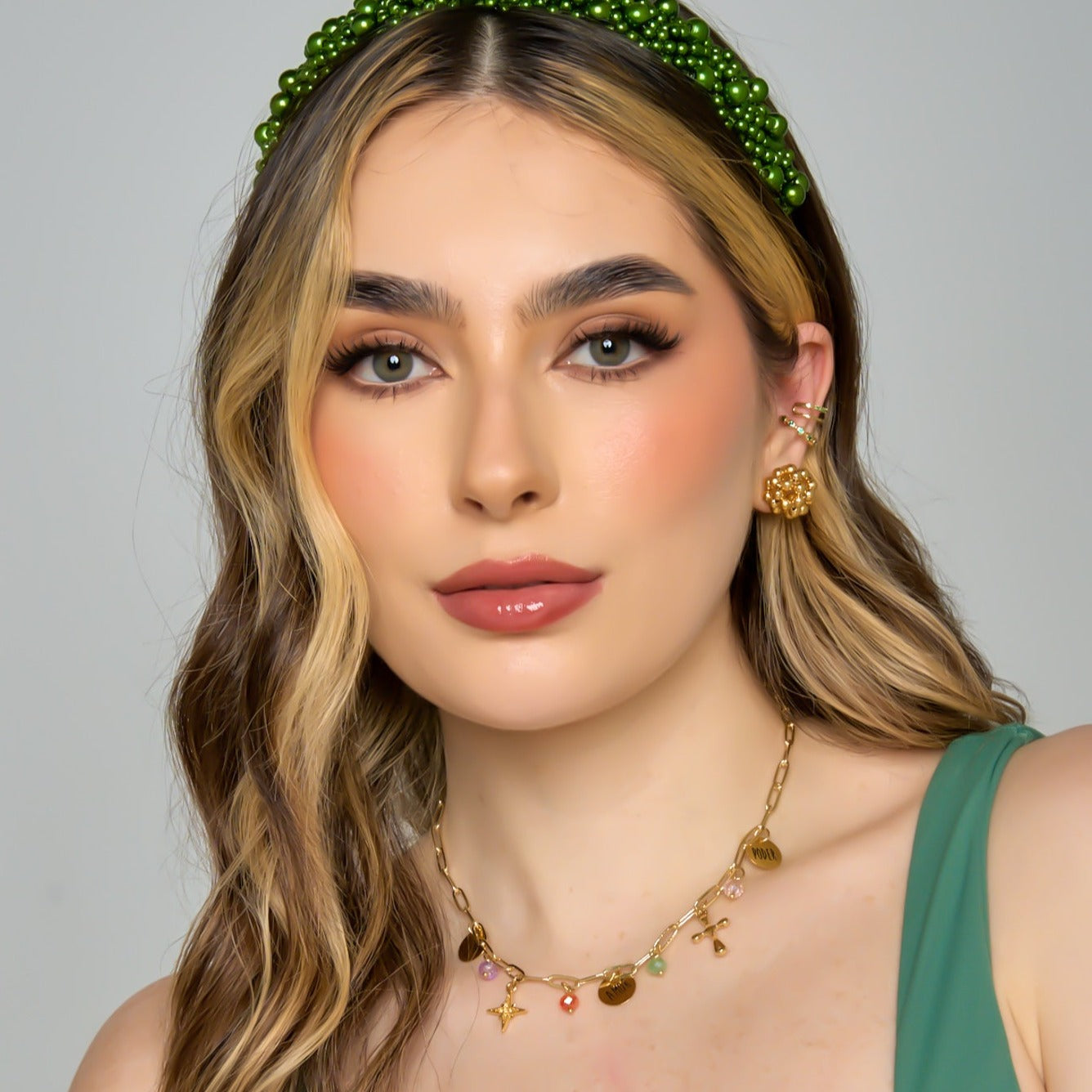 Baño de Oro 24 k y baño en Plata ley 925, recubiertos con laca protectora. utilizamos tejidos artesanales en chaquiras, cristales y piedras semipreciosas naturales.