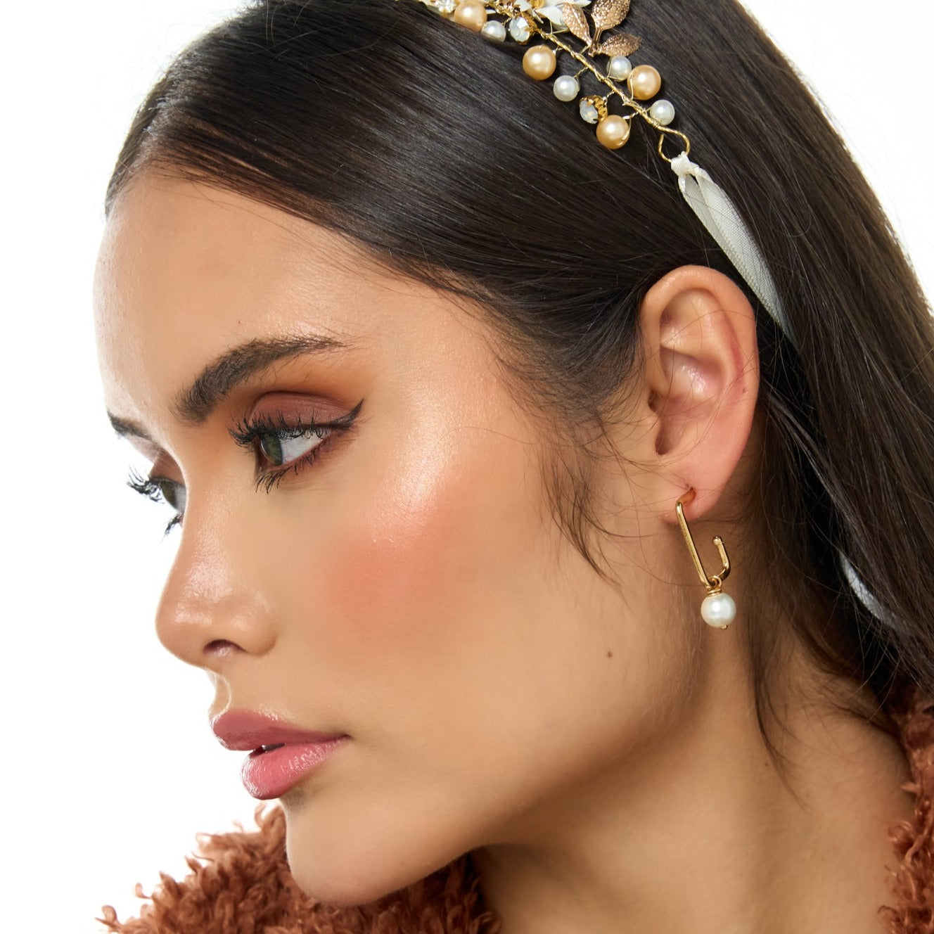 Aretes Candongas Cuadradas Perla Doradas elaborados a mano en bronce con baño de oro de 24k.