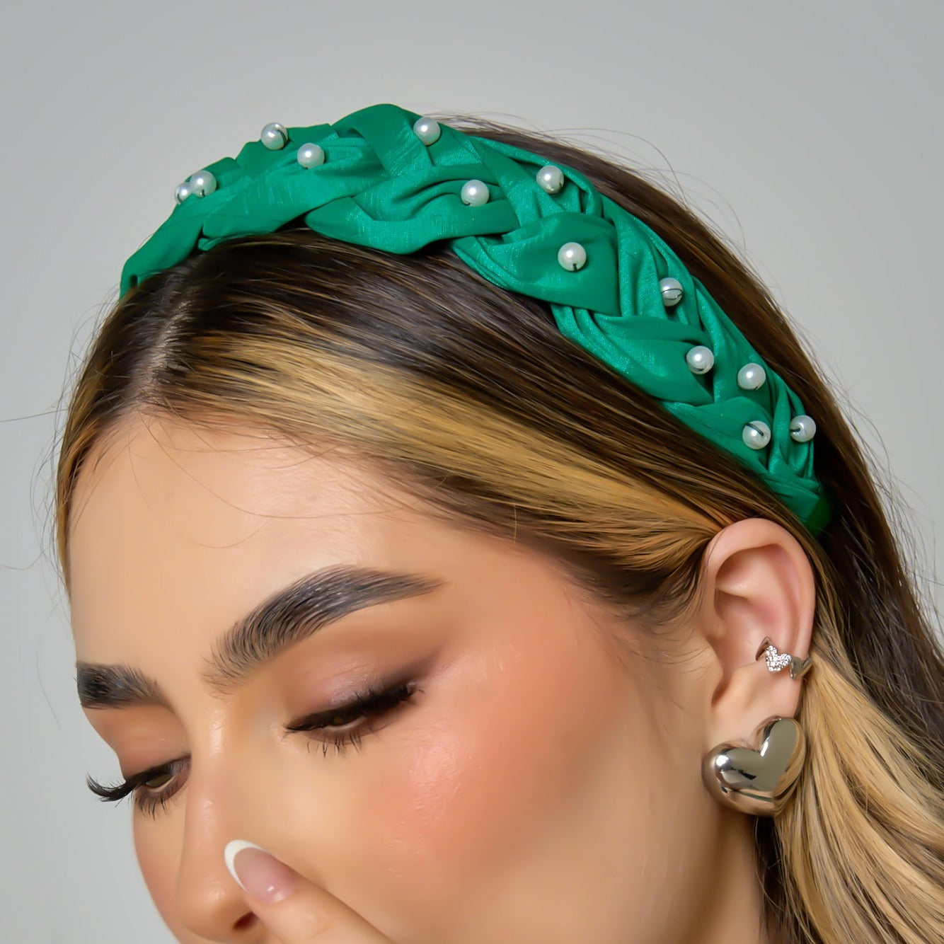 Diadema Trenzada Perlas Conexión Verde Elaborada a mano Con piedras y perlas artificiales