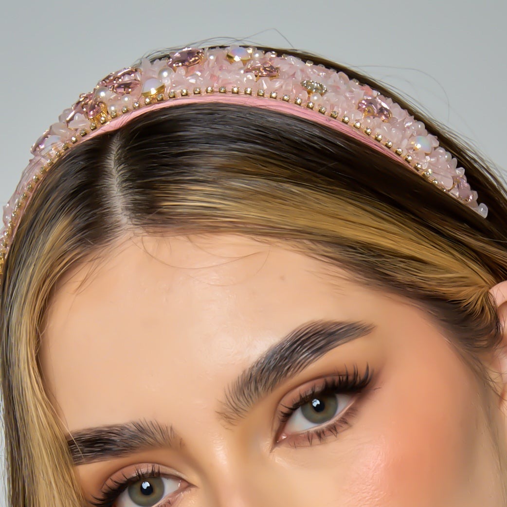 Diadema Piedra Picada Visos Conexión Rosado Elaborada a mano Con piedras y perlas artificiales
