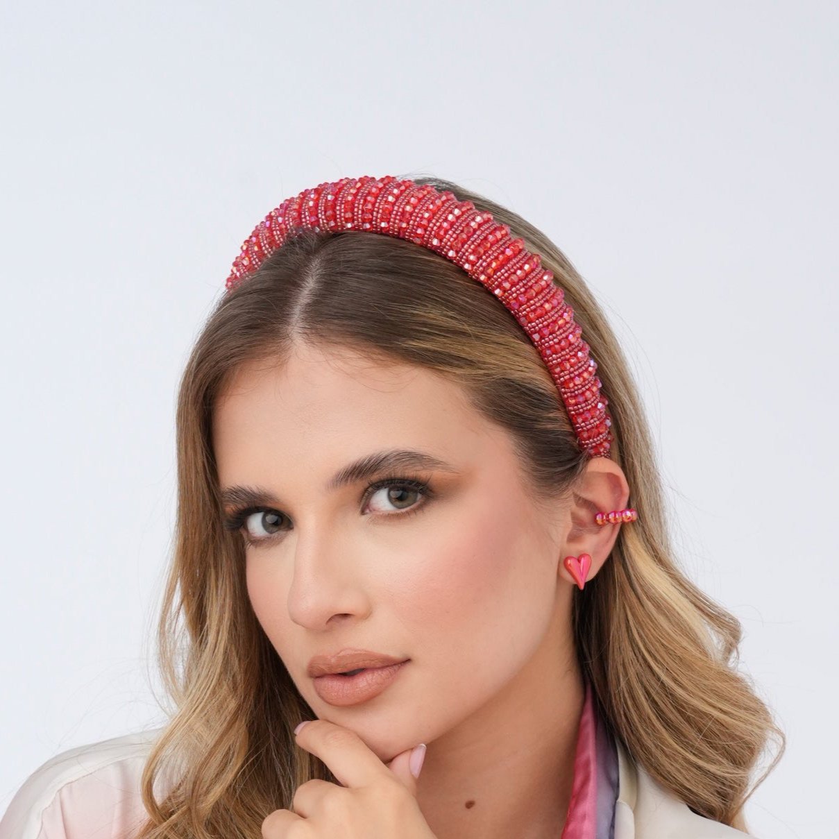 Diadema Tejida Roja Elaborada a mano Con piedras y perlas artificiales