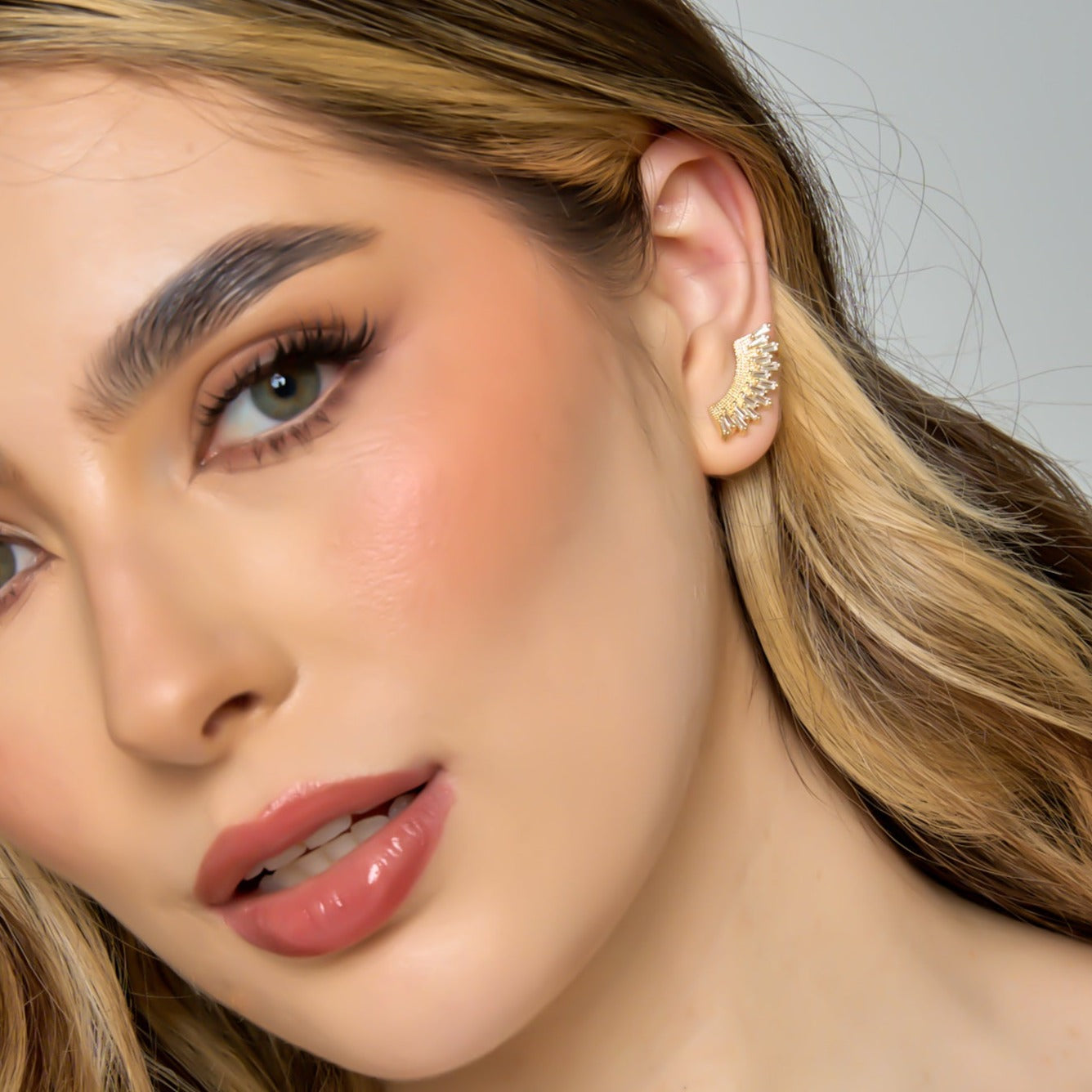 Ear Cuff Topos Abanico Cristales Dorado elaborados a mano en bronce con baño de oro de 24k.
