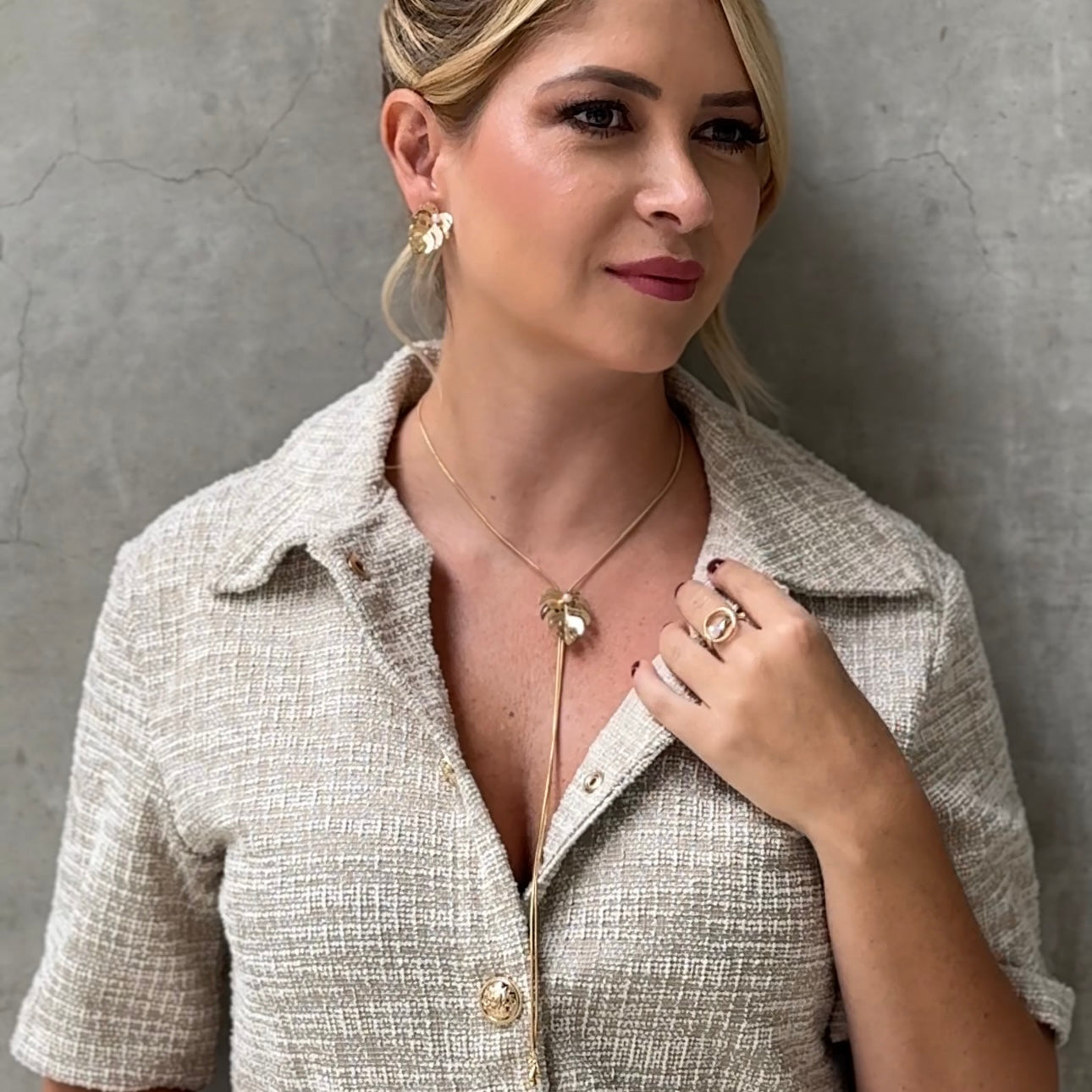 Set Collar Corbatín Y Aretes Hoja Balazo Perla Dorado Elaborada a mano en bronce Con baño de oro de 24k.