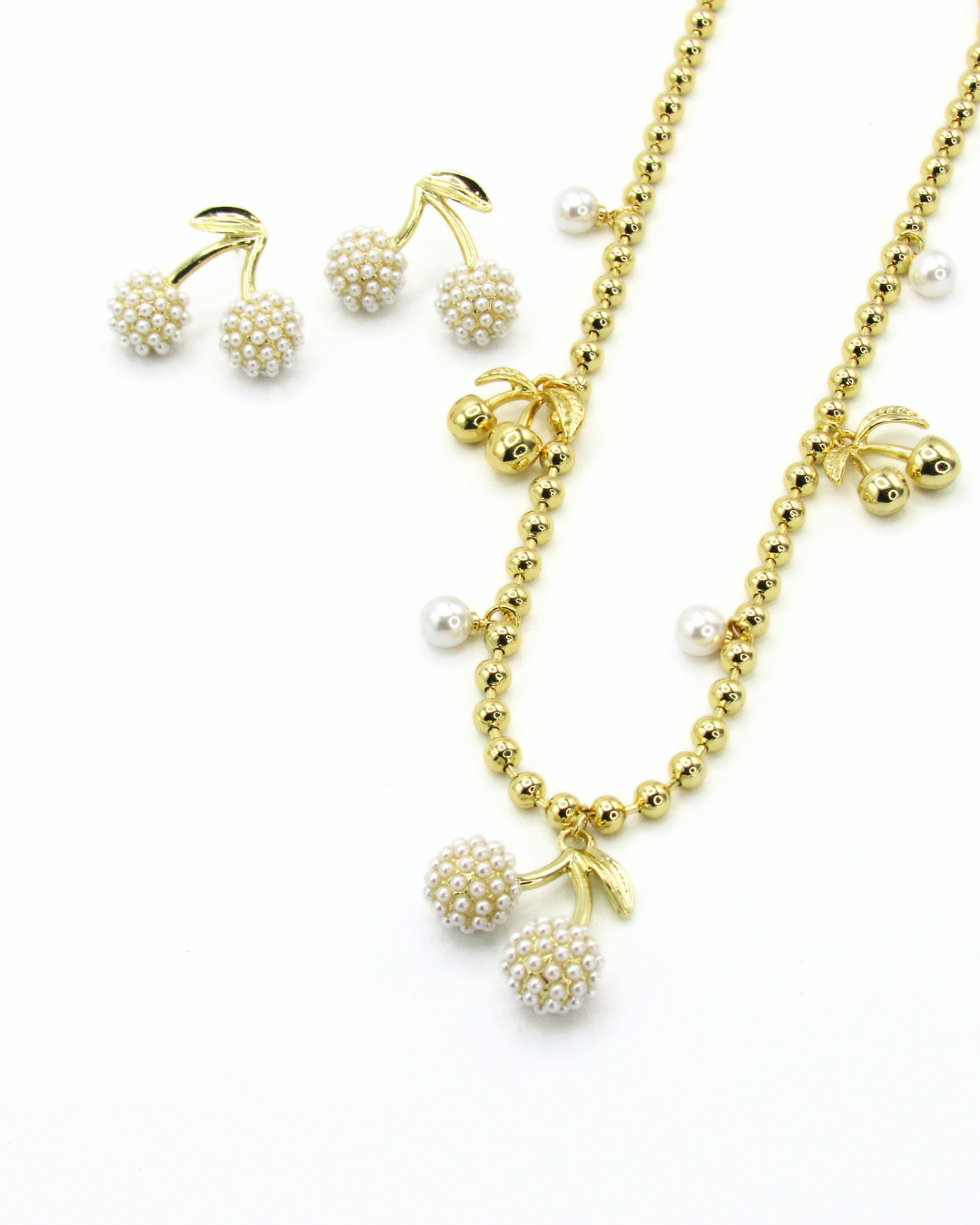 Set Collar y Aretes Cerezas Doradas Con Perlas elaborados a mano en bronce con baño de oro 24k