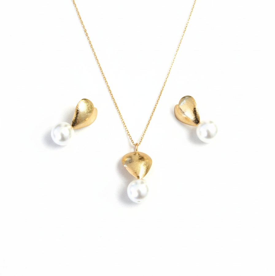 Set Collar y Aretes corazón y perlas Dorado elaborados a mano en bronce con baño de oro de 24k.