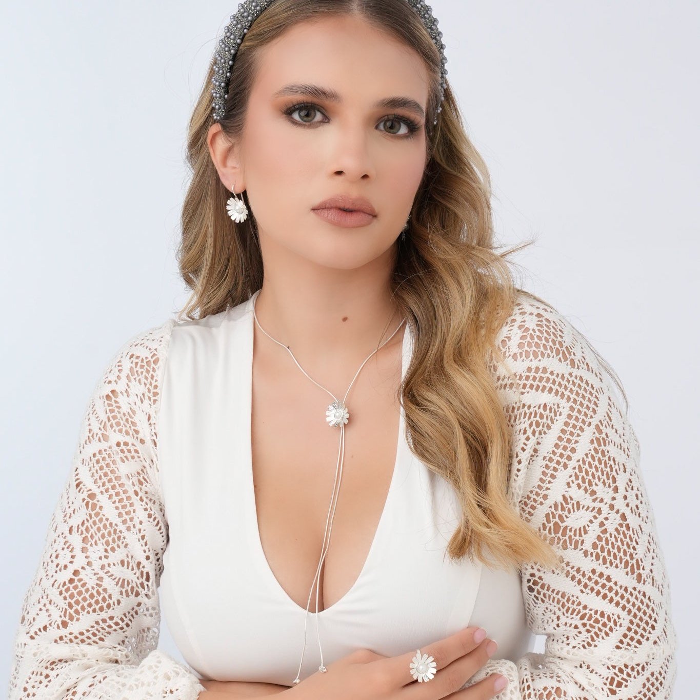 Set Collar Y Aretes Margaritas Plateado Elaborada a mano en bronce Con baño de plata ley 925.