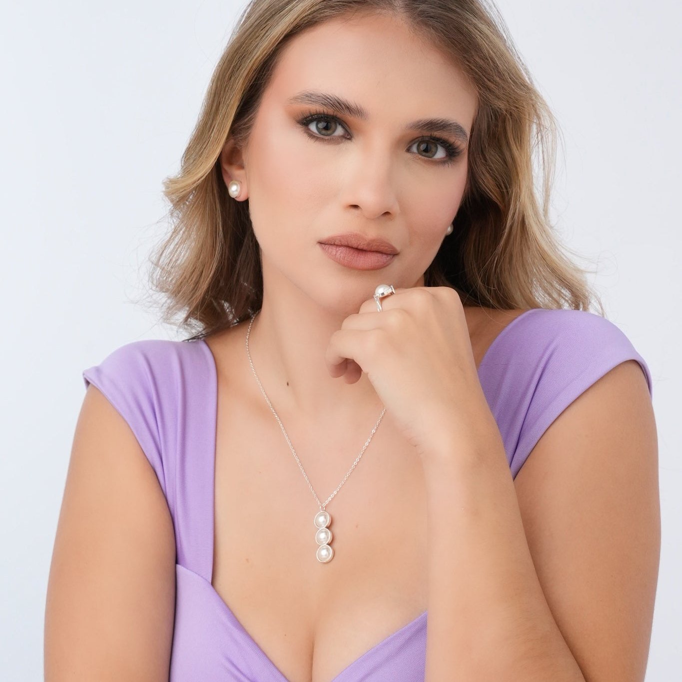 Set Collar Y Aretes Perlas Esencial Plateado Elaborada a mano en bronce Con baño de plata ley 925.